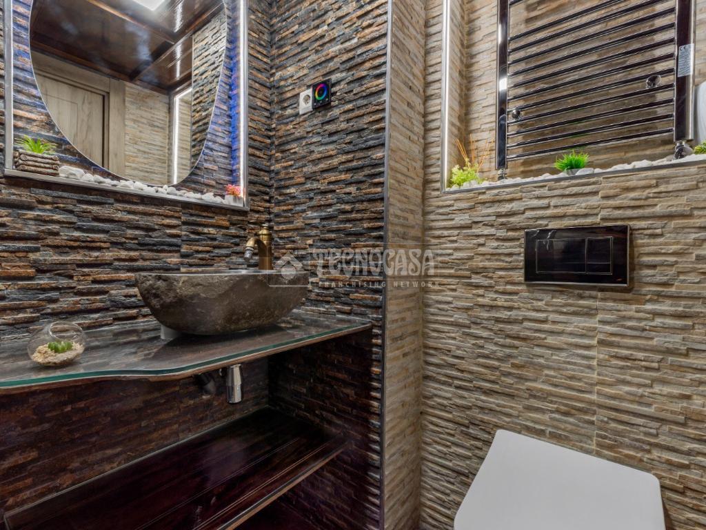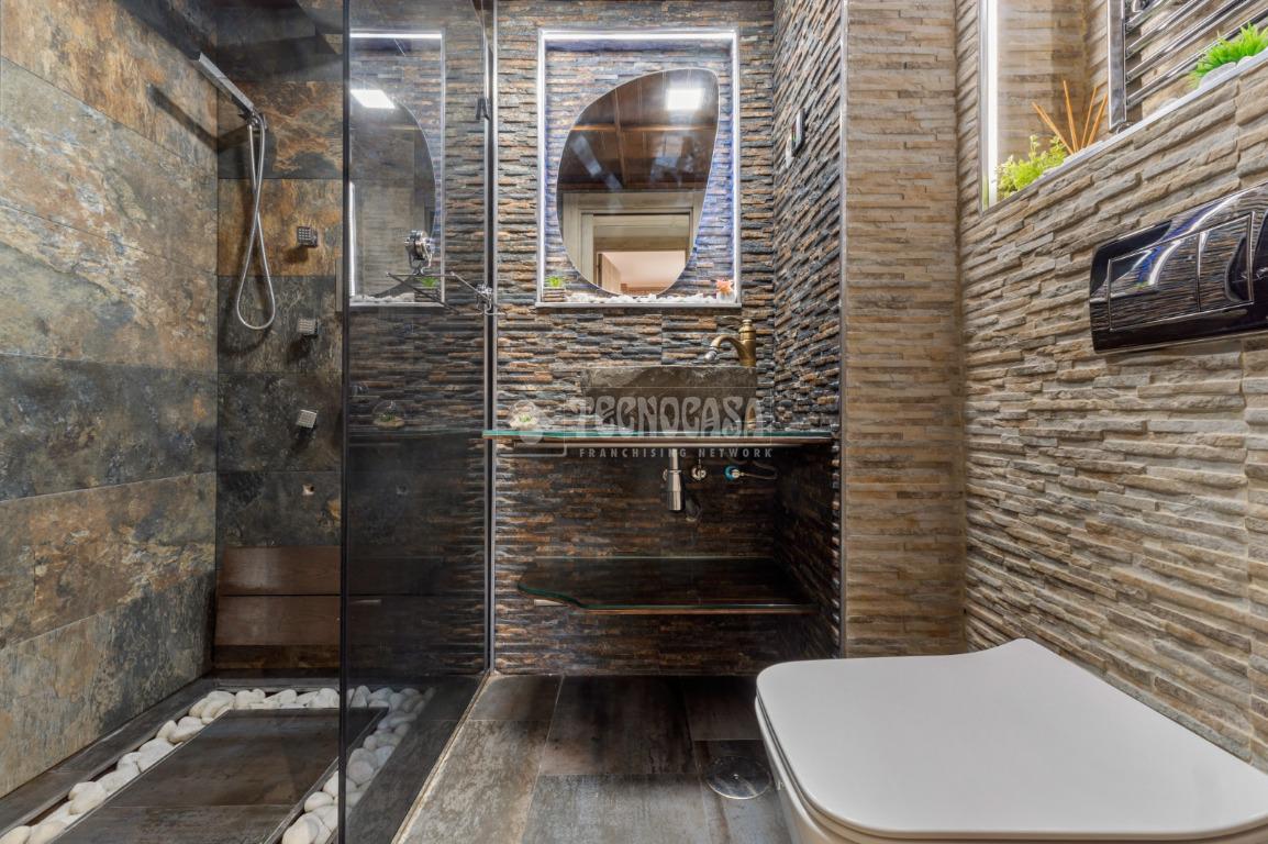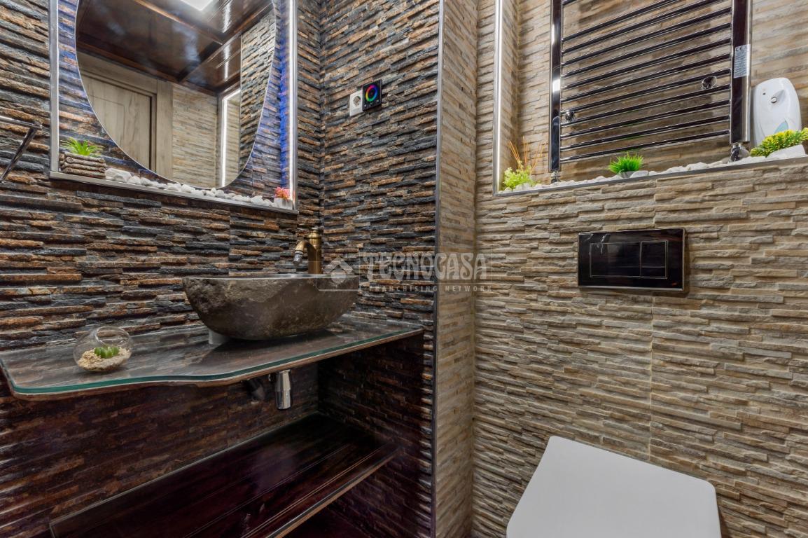 Otro con lavabo de piedra, revestimiento en piedra natural e iluminación ambiental que crea un espacio único.