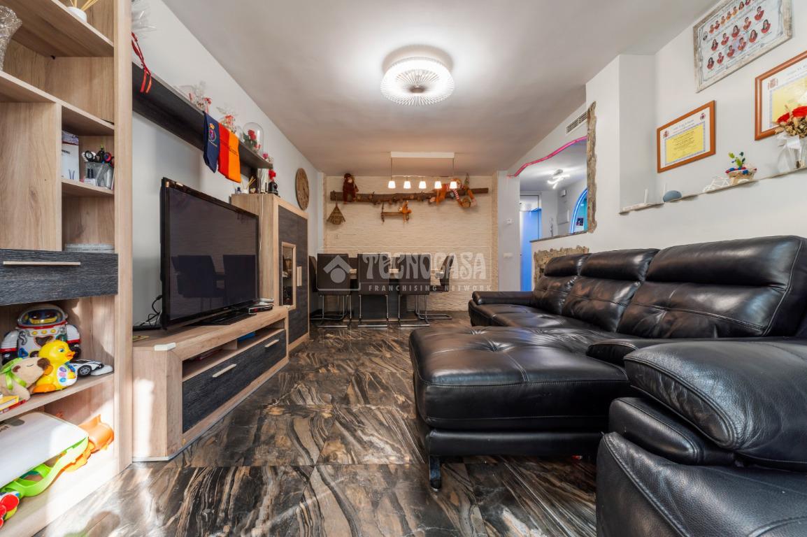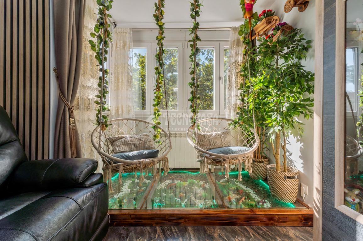 Salón–comedor amplio y luminoso con terraza integrada tipo chill-out, acristalada y decorada con detalles naturales.